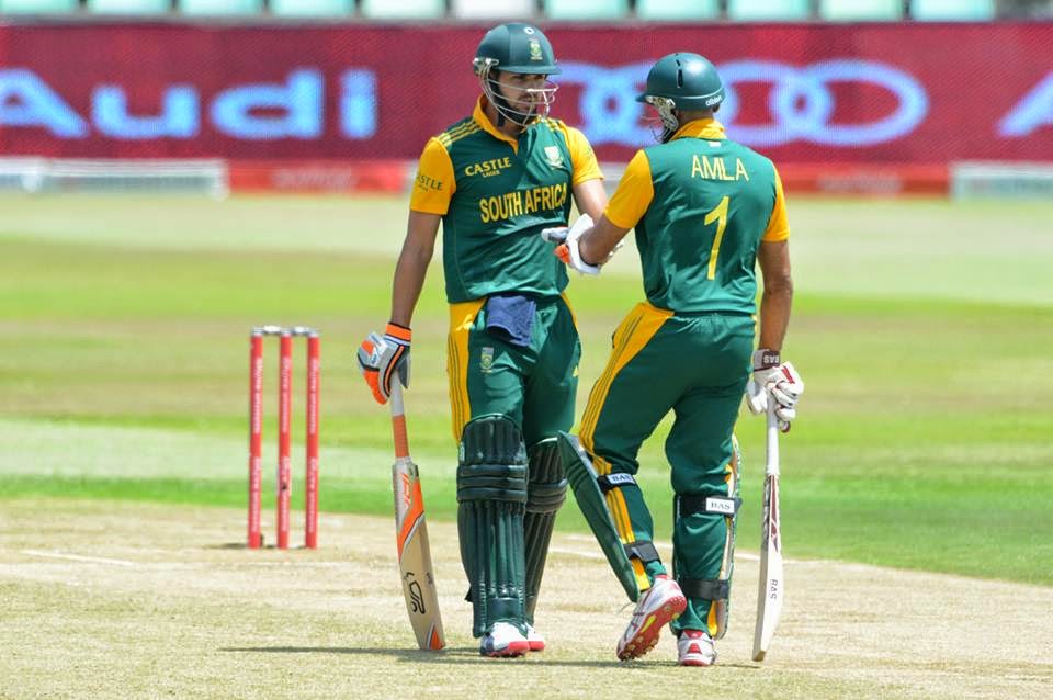 In a match reduced to 42 overs per side when afternoon rain delayed the start by two and a half hours, Amla scored 133 (105 balls, 11x4s, 6x6s) and Rossouw hammered 132 (98 balls, 9x4s, 8x6s) in a South African total of 361.